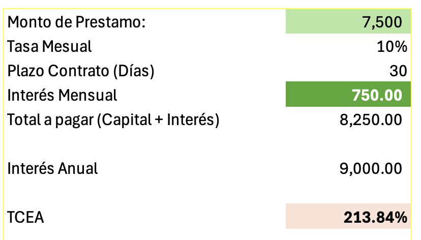 «La Tasa Anual (TCEA): El ejecutivo de la agencia, cumpliendo con la transparencia financiera, le aclara que, aunque él solo ve el 10.00% mensual, el costo efectivo si él decidiera renovar este préstamo sucesivamente durante un año (aplicando la fórmula de interés compuesto) equivale a una TCEA del 213.84%.»
